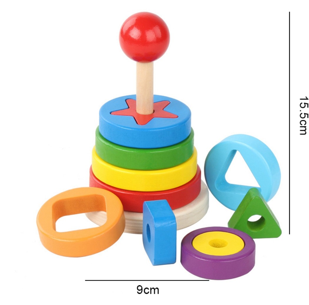 Brinquedo de empilhar como uma pirâmide do maior para o menor cada circulo no seu interior possui uma forma a ser encaixada feito de madeira , material e pintura de alta qualidade.