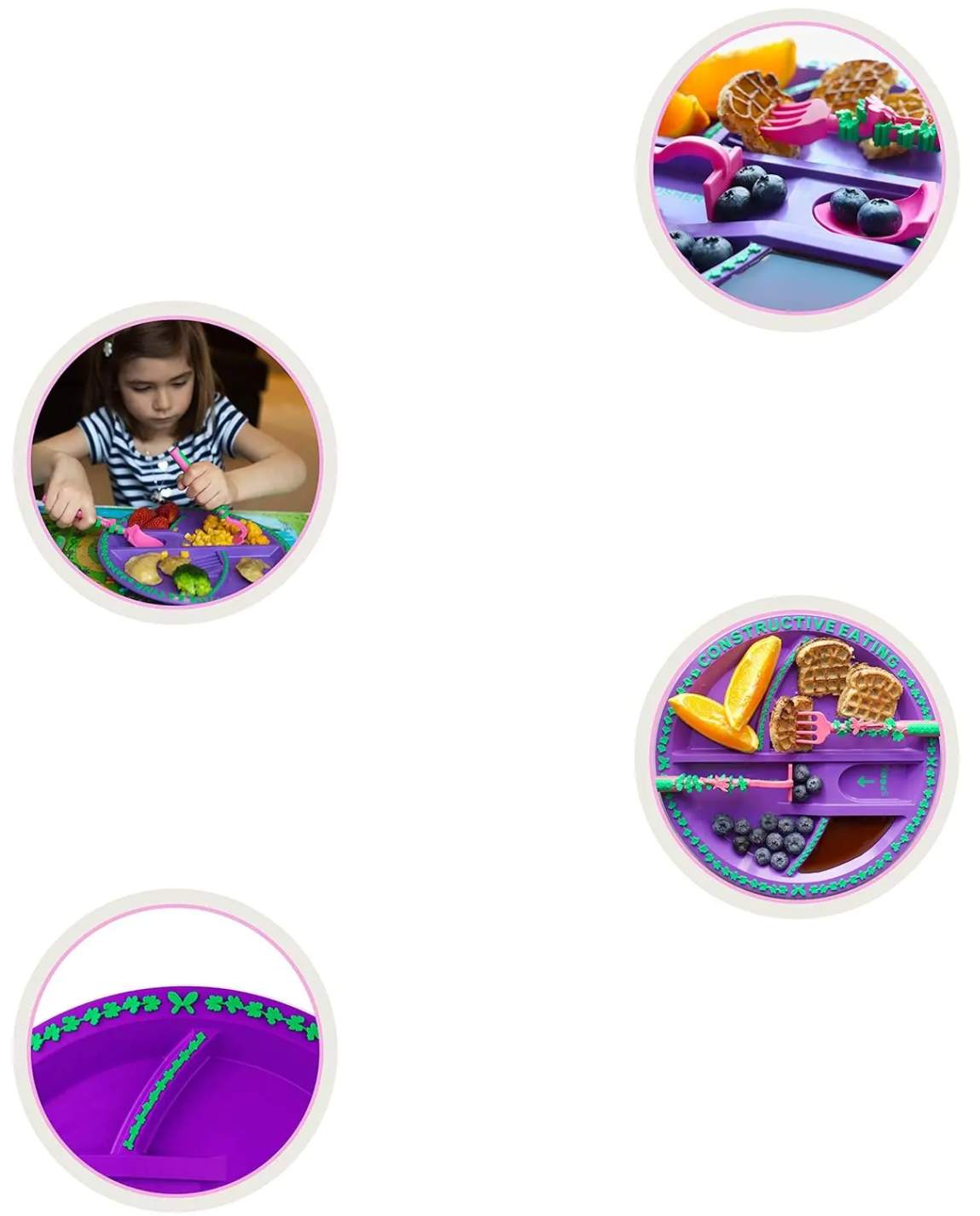 O Prato Dinossauros foi projetado para caber e trabalhar em conjunto com os Utensílios. Pegadas de dino dividem cada seção com locais específicos para o garfo, colher e empurrador para descansar quando não estiver sendo usado para comer.